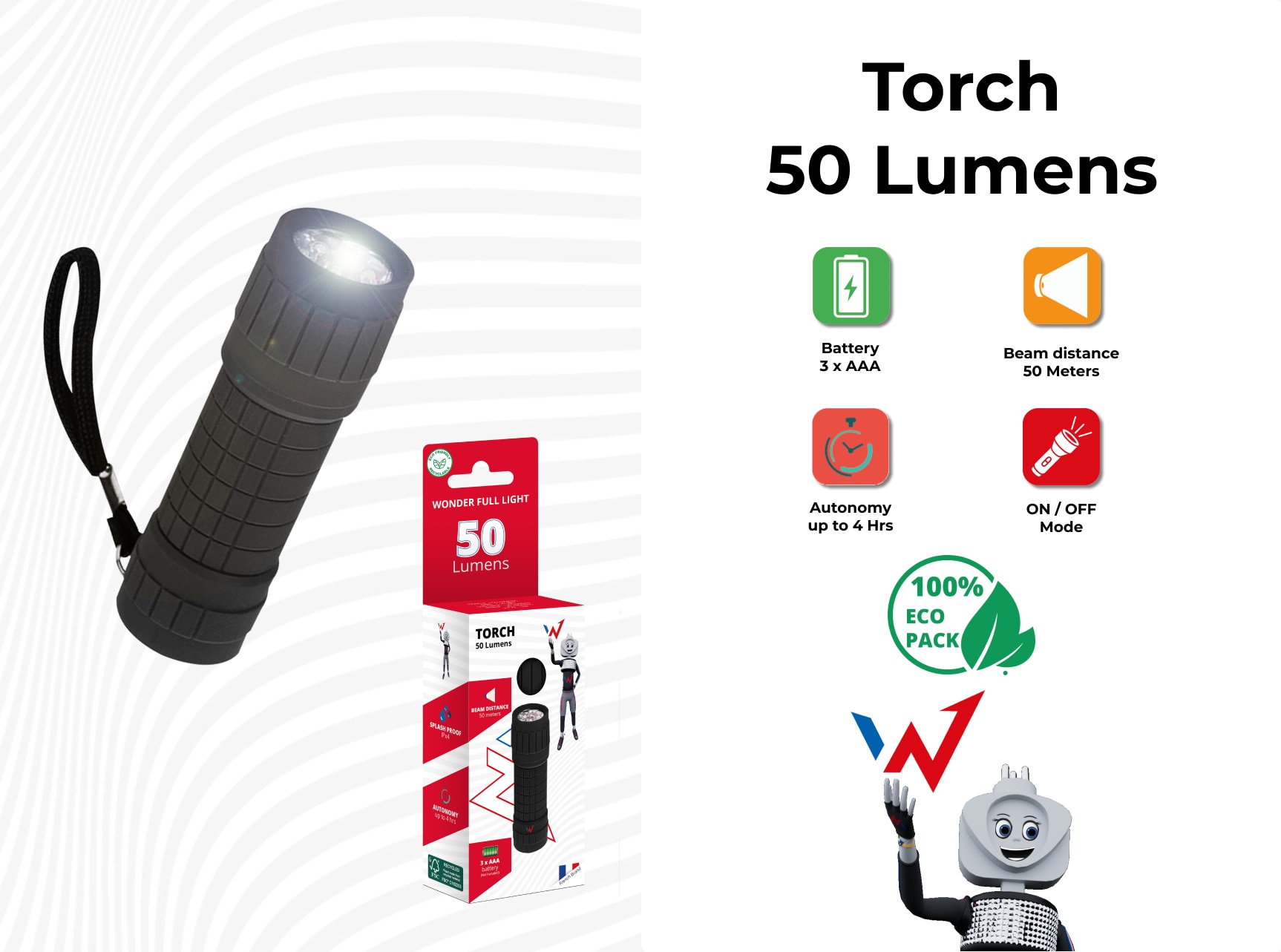 Robusta si puternica, lanterna de 50 Lumeni functioneaza cu trei baterii AAA. Dimensiunile sale reduse inseamna ca o puteti pastra in sertar, in bordul masinii sau in buzunar, astfel incat nu veti duce niciodata lipsa de lumina.