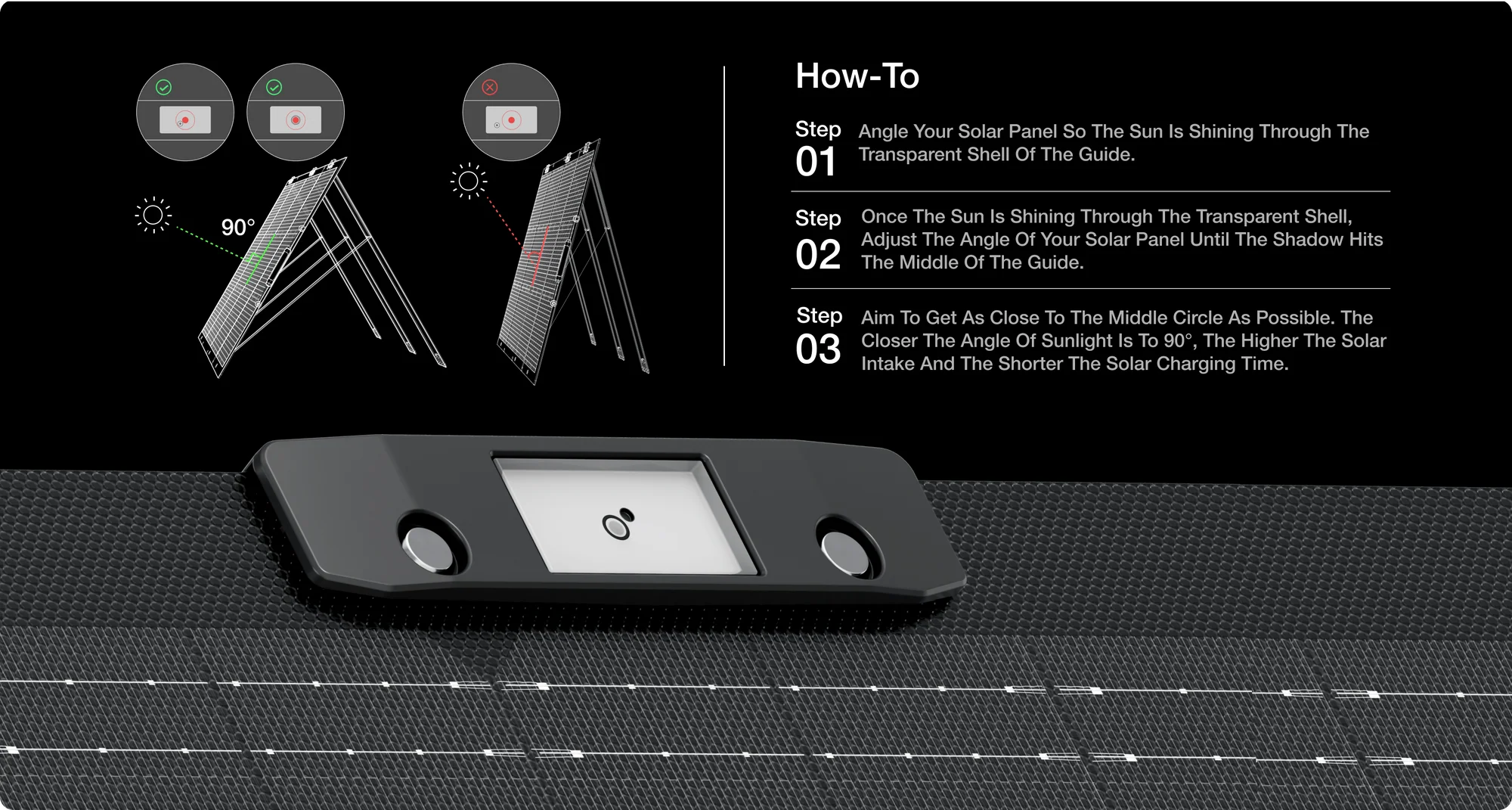 Cu un ghidaj si un suport integrate pentru unghiul solar, reglati unghiul panoului cu 30 de grade in cateva secunde pentru a obtine cea mai mare stralucire solara in orice moment.