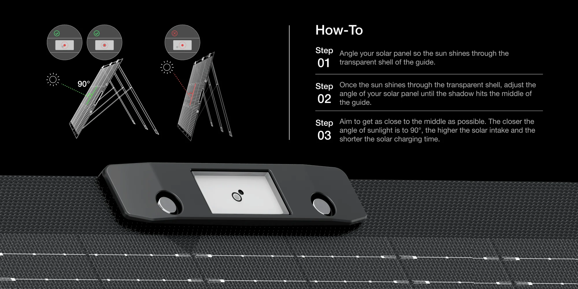 Mentineti lumina soarelui la un unghi de 90° si concentrati razele soarelui pe suprafata panoului solar pentru a obtine cat mai mult soare in orice moment.