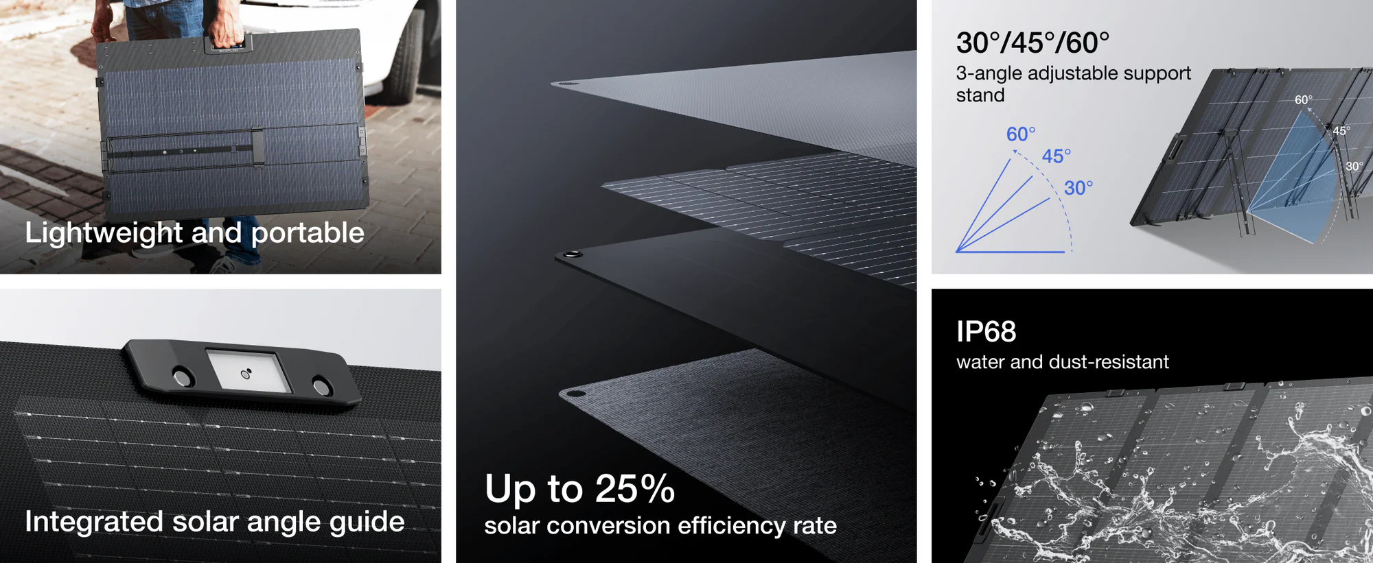 Proiectat cu materiale usoare avansate, acest panou solar de ultima generatie este cu 5,8 kg mai usor decat modelele anterioare pentru transport fara efort si depozitare compacta.